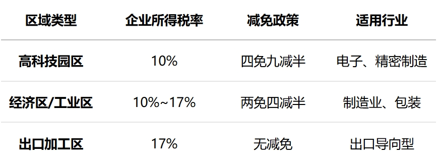 北寧、海防等重點(diǎn)經(jīng)濟(jì)區(qū)提供額外減免,如土地租金折扣(前3年減免50%)